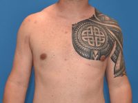 33 yr old male, 5’8 and 190 lbs, underwent gynecomastia surgery using an excisional technique with a scar around the lower aspect of his nipple. Results shown are 6 months after surgery.